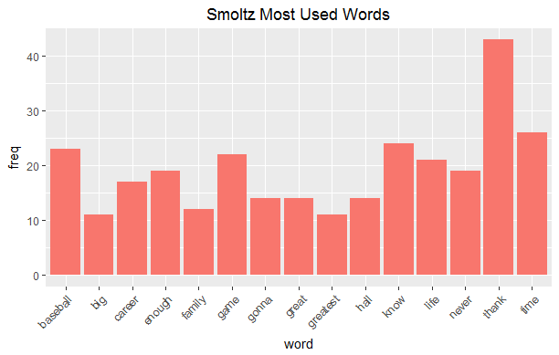 Another staple of text mining is inspecting the most used words, which can help us quickly understand high-level themes of a corpus of text. Unsurprisingly, Griffey mentioned his dad a lot; Smoltz uttered a variant of “thanks” more than 40 times; Maddux had an emphasis on the word “first.”