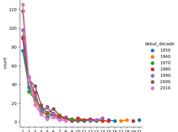 To analyze changes over time, we categorize players by the decade in which they debuted, starting in 1950. Data from 2000 – present is censored. That is, since some players are still active, we have an incomplete picture of their careers and need to keep this fact in mind. We do not know if the “event” we are analyzing might still occur.