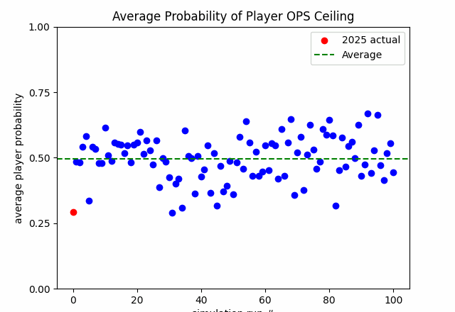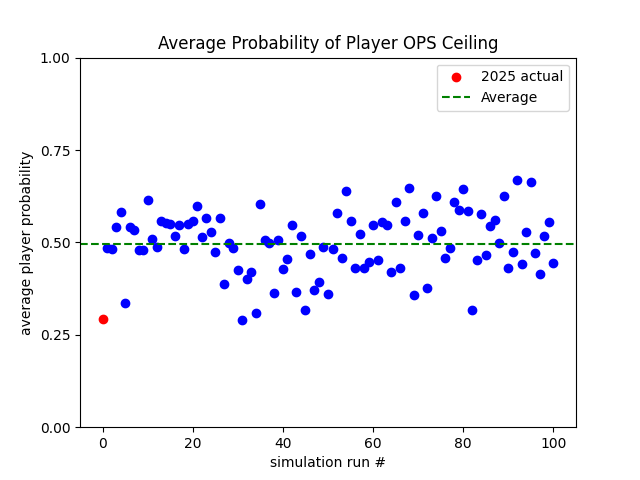 After we generate the simulated values, we can then take the average probability of player outcomes for each hypothetical simulated season. To illustrate, in 2025 so far, the average probability of a player having their actual OPS was 29.4%. In the first simulated season, the average probability of a player having their realistically-generated OPS was 48.2%. (The statements about probabilities are worded slightly incorrectly to get the main point across. The technically-correct wording would be something like “the average probability of a player having their actual OPS or a lesser value was 29.4%”. We could also potentially say “the average probability of a player having their actual OPS be their max possible outcome was 29.4%”. For the technically-inclined, this wording is needed because we use the cumulative density function to create the probabilities in this analysis. The probability density function can state the likelihood of a specific value occurring, but it does not give us a probability directly).